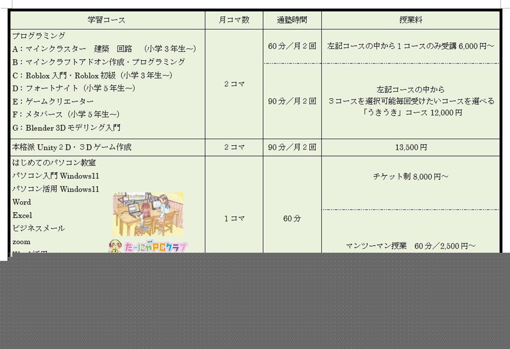 入会金 11,000円 《HPからのお問い合わせやお友達からの紹介でご入会の場合は入会金無料》 ご兄弟・姉妹・お友達 割引適用あり! 開講日 月曜日から金曜日 10:00~19:00 毎週土曜日&日曜日 ①10:00~11:30 ②13:30~15:00 原則、毎月5週目は休講 上記金額すべて税込表記 無料体験レッスン 無料体験レッスンの受付はこちら→お問い合わせページ